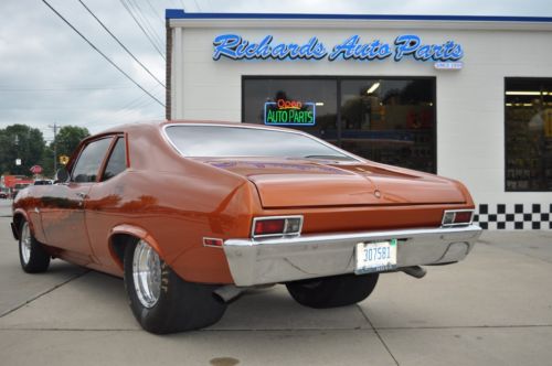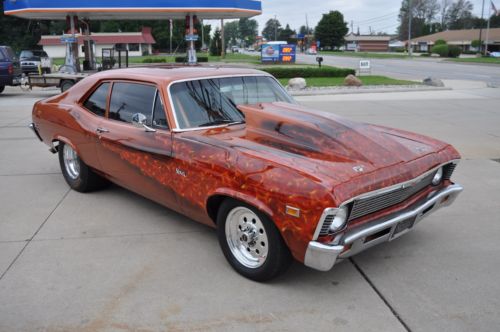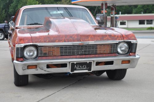 This would be a great car to run around town and Raise Hell with on weekends or take it to the local dragstrip turn the bottle on and get down! This is a Steel car with fiberglass hood. The car is plated, has a factory body and VIN Tag and can be driven on the street. The nova also has roll up windows and wipers along with an alternater. The title is a Michigan title is clear and ready for transfer to the next owner. The Nova sports a sweet paint job with beautiful painted on realistic flames. The paint job alone was 10gs. The rear is tubbed but stll has room for a custom back seat installed if you desire. The car weighs 3600 lbs.