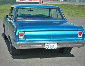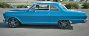 super fast '63 Nova with a 406ci V8 and a Turbo 350 automatic with a manual valve body! The engine has an Edelbrock Victor JR intake manifold, forged pistons, World Products heads, a Holley carburetor, Headman headers, a huge aluminum radiator and it runs fantastic! It is also equipped with disc brakes and an Addco sway bar and CPP front suspension kit. Inside you'll find an incredibly vinyl interior with new carpet, a custom dash with Autometer gauges, and a B&M shifter. It has a cowl induction hood, very nice chrome and glass, SUPER nice blue paint, and nice wide 17 inch D-Force wheels. (Tires: 225/45/17 F, 245/40/17 R) This little Nova SCREAMS down the road and looks the part! This car is so clean. The only thing tachometer and speedomoter are not hooked up.