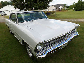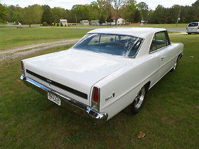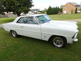 For sale - a very nice 1967 Chevy II Nova, two door, hardtop, rotisserie restored in 2013. The car was painted PPG polar white and clear coated, then buffed to a slick, smooth finish. The factory style blue interior was redone also and has a tilt column, Autometer tachometer and gauges, radio delete (and why would you want one with an engine that sounds as good as this one does?). The 355 cubic inch engine includes Holley, Edelbrock, MSD, Hooker, Flow Master, and more. Transmission is a 350 turbo with a 2800 stall converter and Hurst quarter stick shifter. 3.73 posi rear end with Cal-trac bars and sub-frame connectors. Front end has rack and pinion steering, tubular A arms, and front disc brakes. Weld five spoke wheels, 15 X 4 and 15 X 7, give the car a great look. I can find no rust on this car and the under carriage is detailed very nicely, no under coating, just excellent detail. This car is a clean, neat street machine. True mileage is unknown. This car has been described to the best of my knowledge and I encourage anyone to come look in person or send a representative before bidding. The car is sold "as is" with no warranty and I reserve the right to end the auction at any time. Shipping is the responsibility of the buyer.