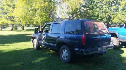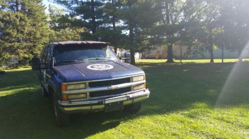 I have a Tahoe fer sale, ***does not have brush guard on it****** comes with many extras, such as seat covers, extra lights, pulleys, drums, brake lines, new rear brake light inner circuit, new oil change/filter, oil changed as should, just recently changed before transmission cracked (so doez windshield). Easy to replace. Starts runs, only in drive or park at the moment. Lights work, turn signals work, put a lot of effort into makin' it look decent. Has three light bars, all connected to toggle switch set up, has PA system along with sirens (yes sirens on yer vehicle, slightly illegal, they were never used, but do work) has an extra radiator and looks good. Just the transmisson is bad. Was my daily driver. The crack in windshield did not obstruct my view due to it being towards bottom of windshield. has power locks, power windows, seat, rear hatch window, with workin' wiper, new radio, with bluetooth, 4 wheel drive works, interior lights work, has emergency flashers along with standard hazard lights (seperate button). Has 2 batteries hooked up due to all the extras put on, may have not been needed but had an extra battery.Also comes with tow mirrors that are also powered, and telescope.Comes with 2 other sets of regular mirrors as well.