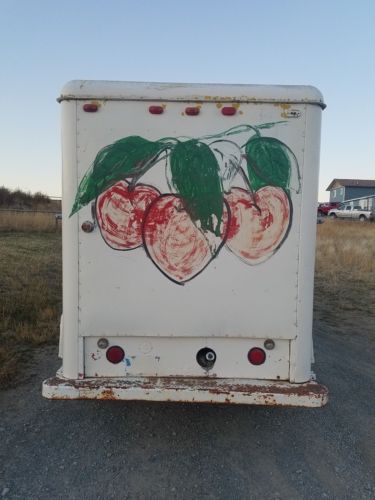 This truck has a nice body for an unrestored 1969 model. No rust. No dents. No filler of any concern. I have checked it with a paint thickness meter. It was painted at some point and could use paint again but the cherries are cool, kind of. I am not sure, but this rig was probably owned by a cherry farm on Flathead lake. The frame, floors, doors, roof, van body, fenders, hood, inner fenders etc etc are rust free. This truck is very dry. The doors all open and close properly. It would be easy to add a polished aluminum grilled and Chrome front bumper to this. They are readily available, as are many body and mechanical parts.