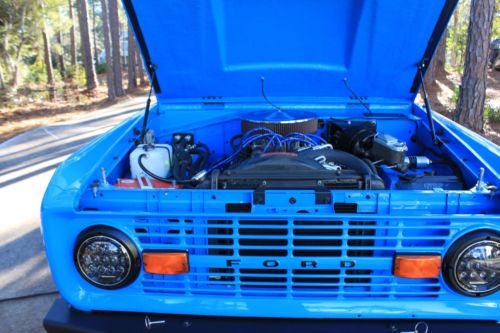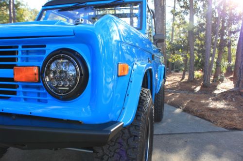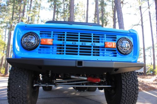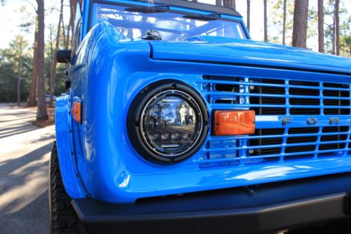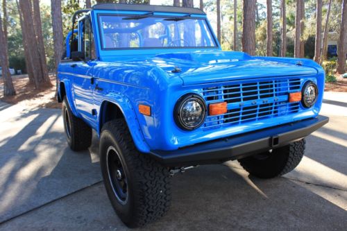 1973 Ford Bronco - truly 1 of 1! PPG Concept Grabber Blue Paint (3 Coats) with PPG Clearcoat. All upholstered with "Baseball" glove style leather interior. Every single portion of this "Unicorn" has been redone and went through. It has a fully rebuilt original 302 along with a rebuilt original C4 transmission. As you can see, the pictures speak for themselves and nothing was left without being completely thought through and went through. Upgrades include but are not limited too - 2.5" lift, 35" BFG All Terrains, 18" Mickey Thompson black wheels, front and rear black fabricated bumpers, custom wood Bronco steering wheel, completely lined floor carriage, tilt steering wheel, custom A/C full installed, Sony stereo system with 4 speakers and custom boxes, LED headlamps, Family style Roll cage fully painted to match, chassis sandblasted and fully painted, power steering, and the upgrades go on. This Bronco is a "One of a Kind" and rides and drives better than newer vehicles. If you want a restored masterpiece with some original roots, look no further. I have included a picture of the original Bronco prior to the complete restoration that was done by HorsePower Restorations in Southern California. The original donor was purchased in Northern California and we have documented pictures throughout the restoration demonstrating the condition this Bronco was in prior to and throughout the full restoration process. It took approximately 10 months to complete the entire restoration. All details of this vehicle and item description must be verified by buyer prior to completed purchase. Happy Bidding and Good luck!