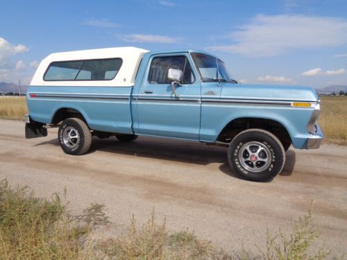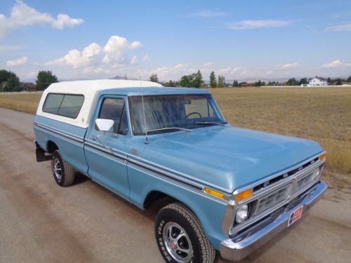 Exterior: Original paint with nice patina, still shines well but paint is thinning on roof, hood, and upper part of doors. Straight truck with only a few minor dings as shown in pics. Roads aren’t salted here, and truck is very dry with only one small corrosion spot from exhaust pipe on exterior body. Underside looks good, cab mounts and drop-offs nice, floor had a small patch repair done many years ago from snow melting off boots in the winter, causing moisture. Of course we don’t see frame rot out here in the dry west. There is some surface rust inside bed from a wooden gear box (no holes), I sprayed it with rust converter, that is the black area you see in pics/video. Wanted to leave options open for spray in liner or repaint. I’d say 95 percent rust free, about as good as I’ve seen in these 73-79 trucks. See detail pics at linked Photobucket album. Factory topper is weathered and needs repaint, also it had a roof vent at one time that has been closed off, but the hole will still be there. Topper door has a fiberglass repair on the underside, not visible unless hatch open and doesn't affect function. Glass is good except windshield has a crack. Grille surround and front bumper are nice, so there’s $800 you don’t have to spend. Overall very nice looking truck that will garner accolades at Cars N Coffee, Home Depot, or Steak N Shake.