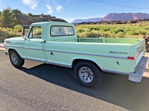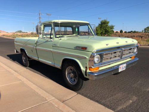 Here we have a 1972 Ford F-250 Camper Special Sport Custom 3/4 Ton 2wd 360 v8 truck. Awesome survivor! When I bought was told has 52k mikes as that’s what odometer says. It could be 152k miles but I would agree with the gentleman who had before me. Good shape for year 98% original. New tires, just over 1k mikes on them. New Valve cover gaskets ,Updated Aluminum Radiator “Does not over heat” Rare Power steering, All original exhaust purs like a kitten, New grease in all joints,Has the Extra backup gas tank “ second tank I’ve never tested or used but was told works, Has the” Rear slide window” RARE most have flat non opening window. The windshield has a minor crack under wiper. Unnoticeable and doesn’t affect viewing. Wipers and fluid works great . All original GLASS. All lights,blinkers work fantastic. Very good brakes stops on a dime! Engine and tranny are awesome running! Minor rust on panels ate through needs attention also in bed mostly surface rust but does have a couple tiny holes near tire guard . Otherwise underside not a lot of rust in good shape! No rust eating through on bottom!! No rusty floor boards!! Very little rust all around but does have minor surface rust here and there. Very minor!! Minor wear and tear not bad at all!!! No AC was installed by Ford. Has the original black leather seat under cover that does have a couple cracks in seat needs attention otherwise seat is nice shape. Missing original stereo. Was leaking oil but just fixed that issue with new valve cover gaskets. Has a little dent on driver door from mirror being bumped into.mirror not damaged! Also on passenger side on the middle chrome trim has a little dent. Very minor! minor scratches ect to paint. Otherwise A great truck and is a eye catcher get people wanting to buy everyday so figured would list and see what happens. !! Very reliable everything works!!. If any questions please feel free. Selling as is and Only local pickup. If you need car delivered to you please have that taken care of and I’ll see it off. I’m in southern Utah. If you lived within 500 miles I would say this Will easily make it! I made a 300 mile trip riding mostly 75 cruisin when I bought it. Very reliable and comfortable. clean title. CASHIER CHECK ONLY! I WILL ACCEPT PAYPAL FOR THE $500 DEPOSIT ONLY. Thanks for your time