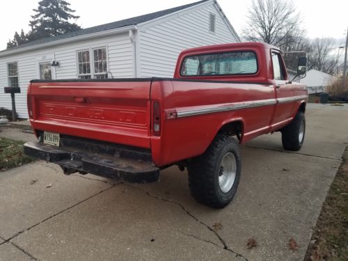 UP FOR SALE IS A 1972 F250. WAS USED AS A FARM TRUCK. ITS IN PRETTY GOOD CONDITION. HAS VERY LITTLE RUST (SEE PICS). HAS A 390 WITH A 4 SPEED. IF YOU HAVE ANY OTHER QUESTONS FEEL FREE TO ASK. SEE PICS FOR CONDITION. BUYER IS RESPONCEABLE FOR SHIPPING.