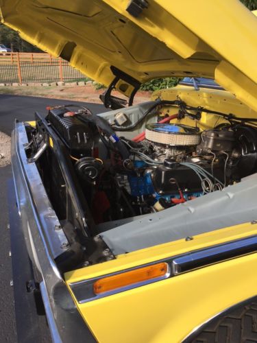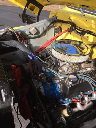 Engine: 400 that has a Lunati cam ( do not know the specs, fixes the timing retard problem on these engines ). I pulled it from another truck, and the cylinders still had the hone marks, so it was ready to do. I put a rebuilt set of heads on it, a Edelbrock performer alum manifold and Edelbrock 4 bbl carb that I rebuilt. Has headers and new dual exhaust to a single muffler. Sounds great. I replaced all the gaskets, as well as added a high output oil pump. Runs excellent, starts immediately, runs strong, no knocks or smoke or leaks. Everything was painted with engine paint. Clean and nice. Engine compartment has been cleaned and painted and looks great. High capacity radiator-never overheating.