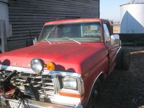 1979 Ford F350 Cab and Chassis with 7.5ft Western cable control snow plow. This truck does not have a title. Truck is equipped with inline 6 cylinder 300 engine coupled to 3 speed automatic transmission with Dana 70/4.56 ratio rear axle. This is a two wheel drive truck with dual wheels on rear axle. This truck has been used for the last 12 years to plow snow at two farms. This truck does not have a title. Plow and truck work well. Recent new front tires (LT235/85R16) and front brakes.Contact me thru ebay if you would like to drive this truck and try out snow plow. Truck is located at Peotone IL. (60468) 40 miles south of Chicago. Truck is listed out side of Ebay and subject to prior sale.