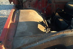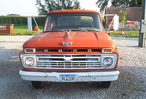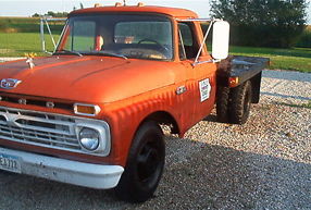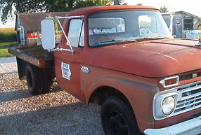 1966 FORD F350 TRUCK with hydraulic lift flatbed box. Faded red paint. 352 2bbl v8 with 4 spd manual trans. Starts well, runs and drives, and the brakes work. Blinkers and lights work. Heater fan motor works. Fuel gauge works. New fuel pump this spring. Good black vinyl seat. (couple rips on end..see pics). Padded vinyl dash has few cracks, but looks pretty good overall. No radio. Hoist works, but controls are stiff to operate. Steering is..well..its ok, but its an old truck thats almost 50 yrs old! Transmission has some bad grinding when you shift to first or reverse gear while engine is running. Has electronic ignition. Good battery. Exhaust manifold has one bolt broke off at head..drivers side..(there is a vice grips holding it currently). Flat bed has a steel covering over the wood deck..(homemade). Couple deck support purlings at the rear gettin thin due to typical rust. Outer fenders have been "patched" down at bottom..(see pics)Inner fenders good and solid. Cab floors have holes by the kick panels. Old carpet remnant and rubber mat pieces cover the floor. Windshield has wiper scuff on passenger side. Drivers side outside mirror glass has been cracked, but still functional. White painted grill is very decent, as is the front bumper. Turning light bezels are in great shape.