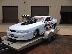 Drag or Burnout car, 2000 Mustang, runs on Nitro. Motor is a KB block, BEA billet heads, BAE mag manifold, SSI 1471 blower, home made injection hat. Twin MSD 44 amp mags. P & P dry sump, waterman red inline pump, Titanium 8 5/8 can, AFT hat and flywheel - 6 stand, rev, DIFF is a 9 1/2'' strange one peace axle. Car is complete running, it also can be converted to run on methanol, it had 3 dvd screens, Also can sell as roller no motor or box.