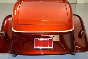 THISIS A NEW BUILD WITH 500 MILES ON THE ODOMETER. BUILT BY RANDYSELL OF MUSCATINE, IOWA OVER A PERIOD OF 6 YEARS. THE PAINT WASCOMMISSIONED BY HOUSE OF KOLORS TO BE THE FIRST CAR PAINTED WITH THE HOKSHIMRIN 2 PAINT. IT WAS TO DEBUT AT THE HOK SEMA DISPLAY IN LAS VEGAS,IN NOV. OF 2012, BUT WAS NOT COMPLETED IN TIME. IT DID DEBUT ATINDIANAPOLIS IN 2012, THE COLORS ARE CINNAMON PEARL AND KANDYBRANDYWINE WITH GOLD GHOST FLAMES ON THE FENDERS & RUNNING BOARDS. AMINOTTI BODY, A TCI CHASSIS, GM CRATE 350/ 330 HP, VORTEC HEADS, GMHEI DISTRIBUTOR, ENDURASHINE EDELBROCK PERFORMER INTAKE AND EDELBROCK650 CFM CARB, ONE OFF CUSTOM BILLET AIR CLEANER, 700R4 TRANS WITHBOWLER INTERNALS, LOKAR SHIFTER, ALUMINUM RADIATOR, SPAL FAN WITHPROGRAMABLE CONTROL, FORD 9" REARWITH 3.73 GEARS DRESSED UP WITH A SO-CAL POLISHED & RIBBED PUMPKINCOVER COMPLETES THE DRIVE TRAIN.