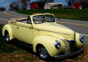 The Details; This 40' Ford Convertible has a rock solid all steel body & glass rear fenders. It has an excellent frame the trunk has no rust with perfect floors. The body is straight and the paint was done in the late 70's presents well as a driver. Certainly has its share of minor scratches and nicks its been driven and enjoyed over the years. It was painted in 69' Cougar light Yellow. 2 year old McKee Cloth Convertible top with origina Power vacuum system that goes up and down easily with original hardware intact. The chrome, glass , trim, are in good overall condition. The Cragar SS wheels w/spinners are in great shape not pitted with new BFG radials that really look outstanding. This Ford has been to the Daytona turkey run for the past 18 years.is a show stopper and was always a crowd favorite. The original seats were redone in tan cloth Mohar-like interior still shows well new carpets etc. It has all the nicest comforts with power steering w/tilt steering column with an expensive Lecara leather steering wheel and Billet dash facia w/VDO gauges, an upgrade Pioneer CD AM-FM Stereo sits neatly in the original radios slot, new updated heating system, turn signals, windshield wipers, seat belts, original Dash with clock billet dash facia VDO gauges and more. Under the hood is awesome to see that sweet running 351 FordWindsor V-8 with Edelbrock & MSD high-performance upgrades. The frame/floors/trunk are straight and solid always garaged in a bubble. This 40' Ford was been built right and a rarity to see in any condition let alone turn-key ready to drive anywhere.