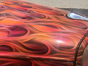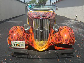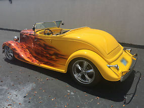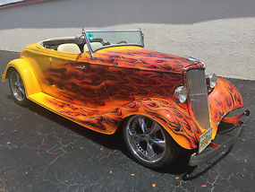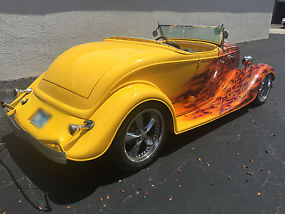 1934 Ford fiberglass Roadster - Custom paint is 6 years old and in great shape with custom air brushed 3 stage flame job with pearl effect. Interior was just redone in ultra leather, custom door panels and inside trunk detailing with new carpet and rag top. The frame was upgraded with a TCI full chassis with air ride suspension so you can set your own ride height, Highboy or slammed on the ground, your choice. New power rack & pinion steering, Wilwood disc brakes, at all for corners, to put the slow in your go at the touch of a pedal. Or hit the gas and the 327 small block Chevy roars to life to push you down the road with your sweetheart. Don't miss out on your chance to own and show off a beautiful ride!