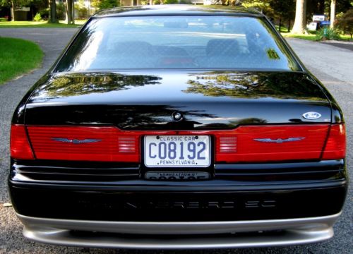 The all original pristine no-hit body is perfect, arrow straight superb original factory Black paint, no scratches, no dings, no touch-ups or paintwork ever. The factory black paint with Special Blue Accents is stunning. All the trim, emblems and glass are all in immaculate condition as well. The Black Mirror Gloss factory wheels are pristine with the original Goodyear Eagle tires which are like new. No sign of drying out due to careful climate controlled storage since day one. The special Black leather interior is immaculate as new thru-out, no passengers have ever sat in the back seats and the passenger seat was only sat in twice it smells brand new inside. The special "Gift Package" by Ford floor mats shown have never been stepped on. The exterior and interior has been properly cared for it looks and smells like a brand new car. A true testament to the care given over its extremely pampered lifetime. The engine compartment is like new it is in show condition. A battery cut-off was added early on (simply because trickle chargers were not available early 90's). The chassis islike new all factory markings still intact all original always dry kept lovingly stored. This is a prime pristine survivor example a rarity to see in Museum show condition throughout.