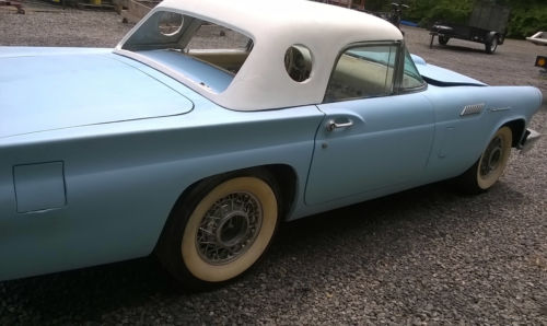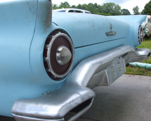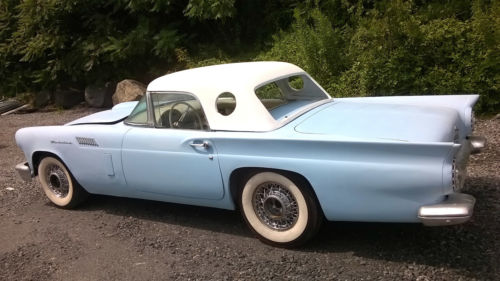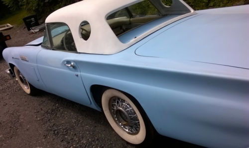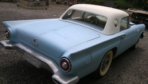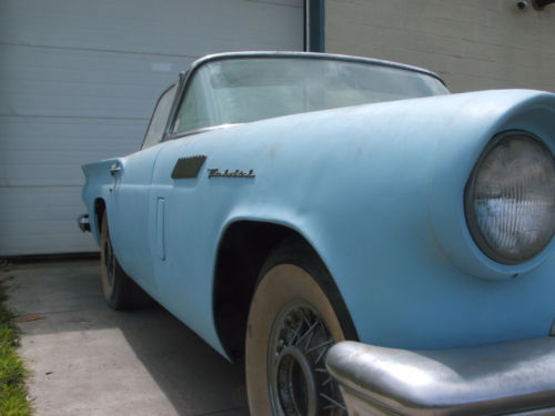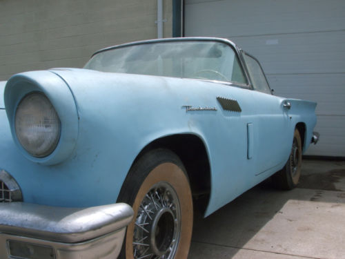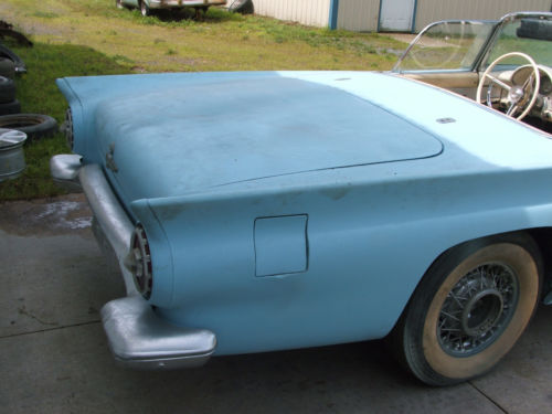 THIS IS A NICE MOSTLY RUST FREE 57 T BIRD THAT WOULD MAKE A GREAT START FOR A RESTORATION PROJECT. THE BODY AND FRAME ARE MOSTLY RUST FREE. THE BODY WAS STRIPPED DOWN AND ANY RUST WAS REPAIRD ON THE OUTER SHEET METAL. THE ONLY SPOT I CAN SEE WITH RUST HOLES IS THE INNER SECTION OF ONE QUARTER PANEL ( SEE PICTURES). WE WERE GOING TO RESTORE THIS CAR AND STARTED THE PROJECT BUT WE HAVE TOO MANY CARS IN PROCESS SO WE ARE SELLING THE CAR AS IS. NO EXTENSIVE METAL WORK NEEDS TO BE DONE ON THIS BODY. THE FRAME IS ALSO RUST HOLE FREE.THE ORIGINAL COLOR WAS STARMIST BLUE SO WE TINTED THE PRIMER THATS ON THE CAR NOW TO MATCH. THIS LISTING IS FOR THE CAR AS IS AND THE PARTS YOU SEE IN THE PICTURES. THE CAR IS MOSTLY COMPLETE AND COMES WITH THE HARD TOP IN THE PICTURE.