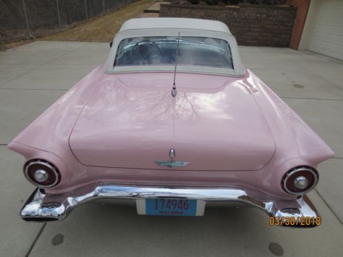 For sale is a 1957 Thunderbird in excellent shape.It has been stored indoors for many years and rarely driven.The exterior is in great condition. It does not have any rust or serious cosmetic issues on the outside of the body. The Dusk Rose paint is in good condition with a few minor paint flaws but overall great with a nice shine. Body straight & smooth w/ no noticeable flaws other than some gaps between body panels. It also includes a black porthole hardtop although one of the latches needs to be attached and the weather stripping could be replaced. Chrome and trim look are in very good condition as well. Convertible top is in good condition and the weather stripping is a bit worn.