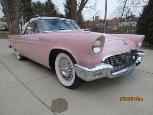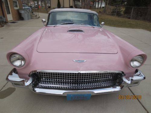 For sale is a 1957 Thunderbird in excellent shape.It has been stored indoors for many years and rarely driven.The exterior is in great condition. It does not have any rust or serious cosmetic issues on the outside of the body. The Dusk Rose paint is in good condition with a few minor paint flaws but overall great with a nice shine. Body straight & smooth w/ no noticeable flaws other than some gaps between body panels. It also includes a black porthole hardtop although one of the latches needs to be attached and the weather stripping could be replaced. Chrome and trim look are in very good condition as well. Convertible top is in good condition and the weather stripping is a bit worn.