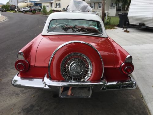 Our family is selling our restored 1956 Ford Thunderbird. Please keep in mind we do drive this vehicle and it is a joy to drive. This cherry red convertible comes with its original white hardtop and white convertible cover. It can easily be said that the 1st generation of Thunderbird was their finest. Between 1955 and 1957 the Thunderbird was a small 2 seat roadster which was comparable to the Chevrolet Corvette. These cars could be had with a 292 CI V8, or an optional 312 CID V8. This T-bird has the larger 312 as well as a Ford-O-Matic 3-speed automatic transmission, along with new wiring, stainless exhaust, and an electric radiator fan. The vivid red paint is stunning along with the red and white interior. This Thunderbird has power brakes, power steering, and many upgrades including air conditioning, seat belts and both the original steering wheel and smaller wheel.