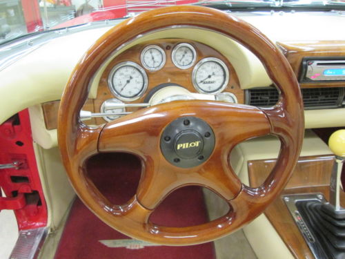 The interior cabin consists of comfortable leather adjustable bucket seats, and a GM tilt column with a custom Pilot steering wheel.The instrument cluster contains all Stewart-Warner gauges and the tunes are provided by a Sony radio/CD player. While the dash mounted air-conditioner provides cool comfort, no heater is available.The console mounted shifter is from B & M, and a curtain-covered shelved storage area is located behind the seats.