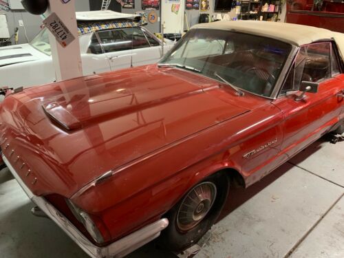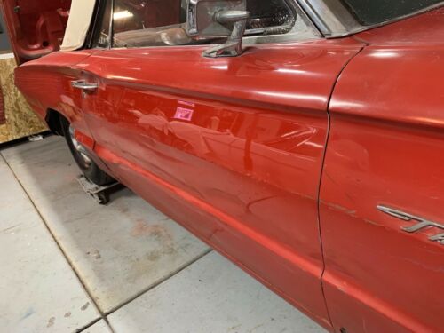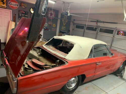 UP FOR BID IS MY 64 THUNDERBIRD CONVERTIBLE .. FACTORY RAGOON RED WITH RED INTERIOR AND WHITE TOP . 390 , AUTO ..94,000 ORIGINAL MILES ..NO AC OR POWER WINDOWS . I BOUGHT THIS CAR FROM THE ORIGINAL OWNERS DAUGHTER LAST SUMMER . IT DOES RUN AND DRIVE . IT KEEPED STALLING NEEDS A CARB REBUILD AS THE FLOAT IS STICKING AND THE POINTS AND CONDENSOR WAS BURNT. I HAVE A NEW DISTRIBUTOR AND OTHER PARTS THAT WILL GO WITH THE CAR.I WILL HAVE THEM INSTALLED BEFORE THE CAR SHIPS. THIS IS NOT A SHOW CAR IT IS A RESTORATION PROJECT . MOST OF THE PAINT IS ORIGINAL AS IS EVERYTHING ELSE .SO IT HAS SCRATCHES AND DINGS HERE AND THERE. INTEROIR WEAR ECTBUT AS YOU CAN SEE THE PAINT STILL SHINES PRETTY NICE STILL. THE TOP IS TORN ON THE DRIVER SIDE AS PICTURED . ITS STILL INTACT BUT NEEDS TO BE REPLACED. THE TOP DOES WORK AND GOES UP AND DOWN WITH THE SWITCH AND DOESNT LEAK . I HAD THE RAMS AND PUMP REBUILT WHEN I FIRST GOT IT. SOMETIMES YOU HAVE TO WIGGLE A RELAY WHEN IT STOPS DURING OPERATION. BUT OVERALL YOU WONT HAVE TO REPLACE THE SYSTEM. INTERIOR IS PRETTY DECENT FOR BEING ORIGINAL IT DOES HAVE SOME WEAR BUTS IT USABLE. THE FLOORS AND THE FRAME ,TRUNK FLOOR ARE SOLID AS IT WAS STORED INSIDE MOST OF ITS LIFE . THIS WOULD BE A GOOD CAR TO JUST DRIVE OR RESTORE.THE CAR HAS A CLEAN TITLE IN HAND. BEST OFFER TAKES THE CAR AS I NEED IT GONE.