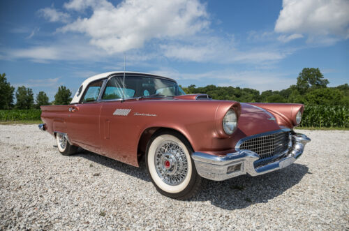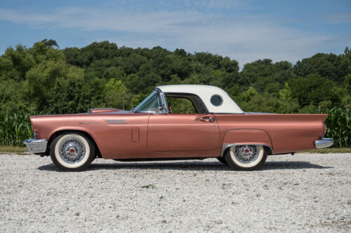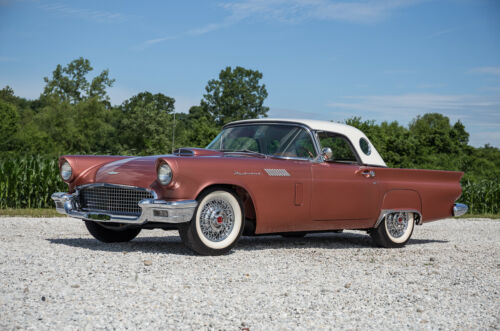 ==57 Ford Thunderbird E Bird Convertible has a 312 C.I. Dual 4BBL V8 (270 HP), Ford-O-Matic Transmission, 9” Rear w/ 3.00:1 Ratio, Correct Color of Thunderbird Bronze, Soft Top & Removable Hardtop, Correct Bronze Interior, Factory “E-Bird”, Power Steering, 14” Chrome Wire Wheels w/ Wide White Wall Radials, Fender Skirts, Detailed Engine Bay & Undercarriage, Full Size Spare & Jack, Correct Dual Exhaust Exiting Through Rear Bumper, In Dash Tachometer & Clock, Wind Wings, Extensively Restored E Bird w/Air!