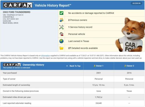 This 2002 Ford Thunderbird is whisper white with black leather and is powered by a 3.9-liter V8 paired with a five-speed automatic transmission. Equipment includes a black convertible top, a body-colored removable hardtop, chrome-finished 17″ alloy wheels, dual-zone automatic climate control, cruise control, and an AM/FM stereo with an in-dash changer. This Thunderbird has 26,543 miles and is offered with a clean Carfax report and a clean Texas title in the seller’s name. There is a small scratch on the right-rear corner which was touched up. This is visible in the picture. Additional pictures are available upon request. Free clean CarFax available upon request.