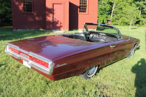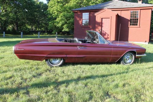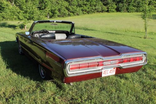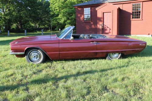1966 THUNDERBIRD CONVERTIBLE 390 ENGINE TRANSMISSION BRAKES WORK GOOD MAROON WITH WHITE ROOF, BLACK INTERIOR COMPLETE CAR, CURRENTLY GOING TO CAR SHOWS EVERY NIGHT, RADIO WORKS GOOD, POWER WINDOWS, POWER SEAT, TOP MECHANISM WORKS AND CYCLES COMPLETELY UP AND DOWN!!! TRUNK PAN LOOKS OK, WILL NEED FRONT FLOOR PANS, RUST IN QUARTERS, NEEDS TOP, EXHAUST MANIFOLDS TYPICAL LEAKS. COULD RESTORE OR DRIVE AS IS