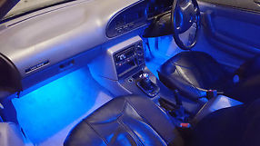 Neon blue lighting in the cabin light, footwells operated by switch and in the tray operated on another switch. Octane tint from tint-a-car.