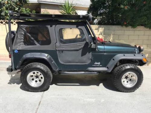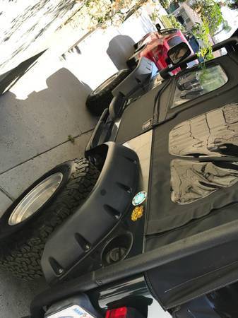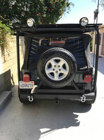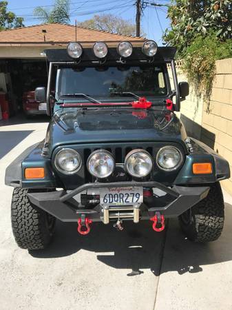 Hello and thank you for looking. This Jeep Wrangler is in extremely well kept condition and everything on it runs well. The car has extremely low milage for its age and runs excellent. It has a nice CB radio that is very fun and adds an extra level of excitement. It has beautiful lights in the front and the back that will light ip the desert of the mountain. It has new bumpers and new steps to assist your passenger into the jeep. It has a bar that supports a custom built platform that you can detach anytime where you can put your air mattress or anything you want on top of it such as luggage. Garmin GPS attached. Brand new wench included. And it comes with a freebie - the old bumpers. It has a unique beautiful dark green finish that still maintains its shine. The grey cloth interior is brand new and well kept in its still new condition. It is very tidy and has no rips or tears or stains. This jeep has thousands of dollars worth of aftermarket modifications added, including suspension lift and brand new BF Goodrich All Terrain K02 31-10.5 tires. The Jeep was not abused off road. This jeep has only travelled 68,000 miles in its pampered life, mostly to the Joshua Tree National Park. There are no check engines lights. These jeeps are great reliable cars. These jeeps are legendary off road vehicles and are highly sought after. It is very comfy inside and offers decent fuel economy. This offers a great package for both the winter and the summer, a great 4 wheel SUV in the winter, and completely removable top for summer fun. For a road trip, or your next off road trip. With so many features this jeep can serve so many purposes and provides a great value.