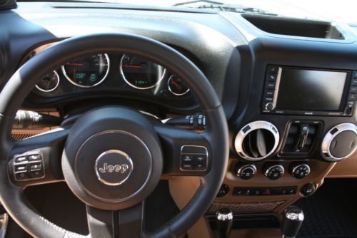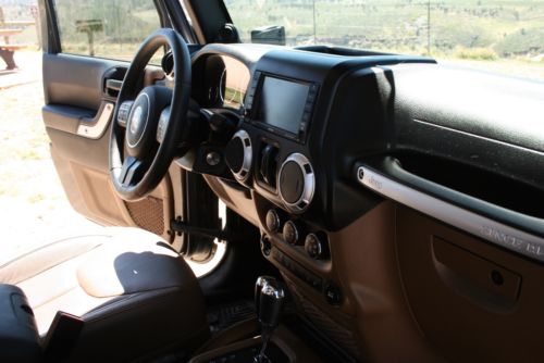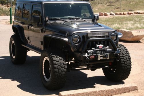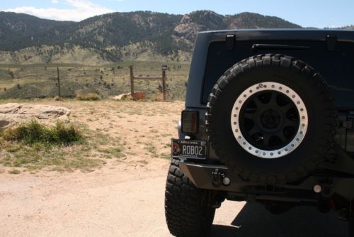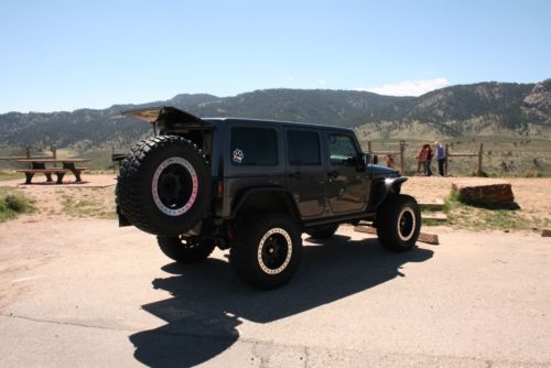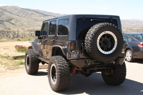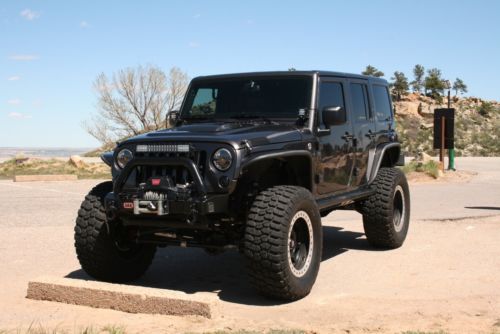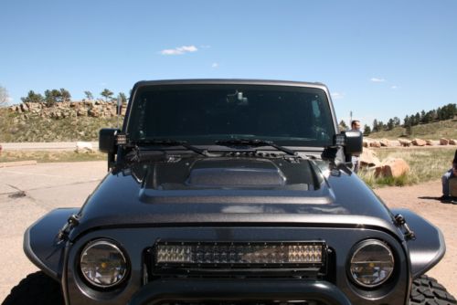 It features an on board ARB air compressor, KC LED headlights, ARB front and rear air locking differentials, 20" trail ready (TR) racing beadlock wheels, 38x14.5 new BF goodrich KTM tires, 6pac metal cloak shocks, 5.5" lift, truss reinforced dana 44 axles front and rear, 35 spline chromaly rcv axle shafts, rigid light bar and column mounted spot lights, 10000 lb warn winch, custom exhaust, cold air intake, AEV heat reduction hood, ARB stubby front bumper, poison spyder rock slider and rear bumper, fox steering stabilizer, interior switch column including compressor and differential controls, 5 speed automatic, U-connect connectivity center, weather tech mats front, rear, and cargo, tow package, and electronic sway bar disconnect. The base model of this jeep was a Rubicon, but not much of it is left. Tom woods driveshafts were added in order for the drive-train to handle the massive output of the engine (410 hp 427 lb-ft torque). In order to bring it to a complete and quick stop, BAER performance brakes (6 piston front 4 piston rear) and heat dissipating slotted rotors were added. The total articulation of this jeep was measured to be 3'. A viper smart start and security system was added for extra protection and convenience.