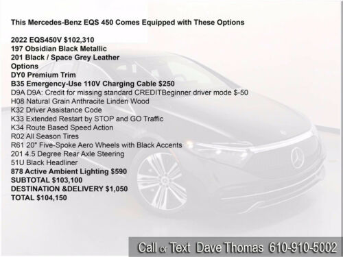 This Mercedes-Benz EQS 450 Comes Equipped With These Options.2022 EQS450V $102,310197 Obsidian Black Metallic201 Black / Space Grey LeatherOptionsDY0 Premium TrimB35 Emergency-Use 110V Charging Cable $250D9A D9A: Credit For Missing Standard Creditbeginner Driver Mode $-50H08 Natural Grain Anthracite Linden WoodK32 Driver Assistance CodeK33 Extended Restart By STOP And GO TrafficK34 Route Based Speed ActionR02 All Season TiresR61 20" Five-Spoke Aero Wheels With Black Accents201 4.5 Degree Rear Axle Steering51U Black Headliner878 Active Ambient Lighting $590SUBTOTAL $103,100DESTINATION &DELIVERY $1,050TOTAL $104,150