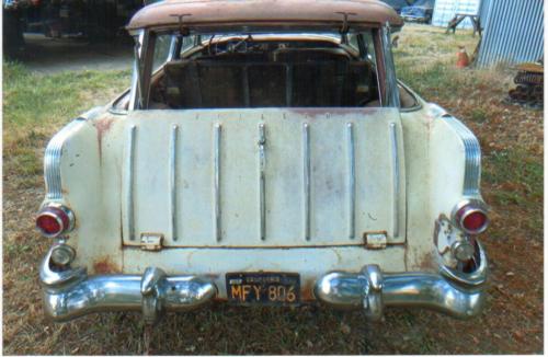 1955 Pontiac Star Chief Safari Wagon. A super rare, chrome-plated, milestone jewel, ready to be polished. Nicely optioned, 99% complete, correct seats, the leather, vinyl and mylar interior is ragged but complete for patterns. Perfect body, Firegold & Ivory, right and left side rocker, spare tire, and driver's floor rust (repair panels included) nothing major. Last reg. 1964. Totally original. Year stock 287 CID, V/8 4-speed hydro, P/S, P/B, radio, heaters, clock, oil bath, BU lights, Master guard front and wing guard rear bumpers, lighted hood ornament, w/shield washer.