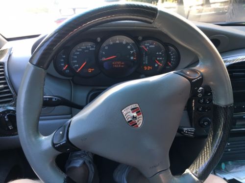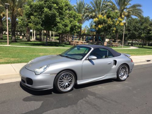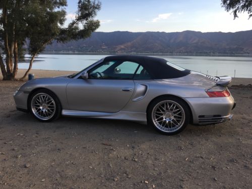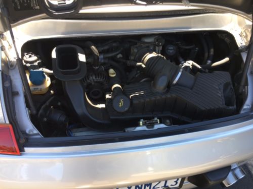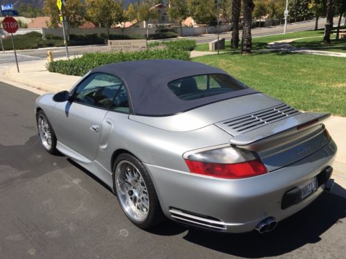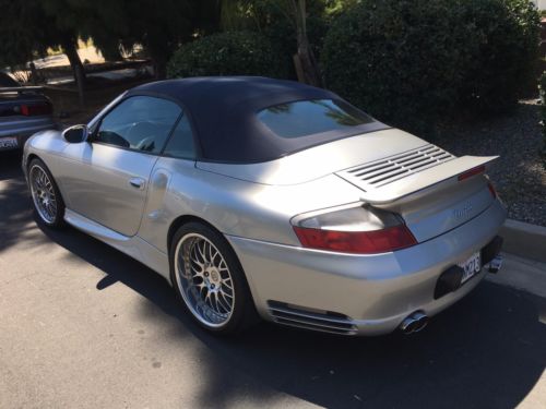 2003 Porsche 911 Cabriolet, AWD, 43.8K miles, turbo-look package, 6 speed automatic tiptronic, silver exterior, grey interior.