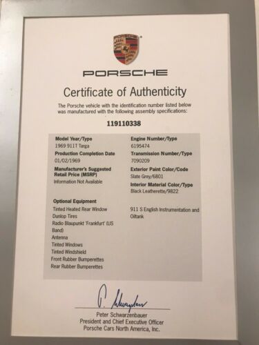 This is an amazing opportunity to own a true classic, this 1969 Porsche 911T matching numbers is ALL ORIGINAL, this Slate Grey gem has never been repainted and is in spectacular original condition (as if it where in a time capsule). It has just celebrated its 50th Birthday January 2nd 2019, as per the accompanying Porsche COA. This beauty is very well documented with original tool kit, as well as owners manual documenting oil changes back to the early 1970's. The Engine runs like new and she shifts like a dream, the radio is also in fine working condition. This is truly a rare opportunity for the enthusiast! Enjoy!!