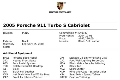 Rare, Riveting And All-Encompassing: Worldwide production of only 960 cabriolets. Manual. Mezger. PCCBs. Larger Turbos. This exquisite, 2-Owner, 2005 911 Turbo S Cabriolet stuns in its Black over Black colorway (Yellow seat belts and brake makes for a welcoming contrast), displays a low 18,XXX miles from new along with a Clean CARFAX. Its specifications include Heated Front Seats ($480); Park Assist System ($530); Black Full Leather; Inst Dials Yellow Red White Blue ($1,270); Front Air Intakes Painted ($715); Storage Lid Bin W/Porsche Crest ($285); Foot Well Lighting Turbo Cab, Black Mats - Porsche lettering ($115); Black Top; Sport Shifter ($765); Rims and Caps - Exterior Color ($1,290); Seat Belts - Speed Yellow ($540); and the Custom Tailoring specification.
