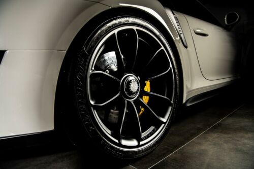During the commission of the GT3 RS the car was appropriately fitted with the desirable Weissach package at a cost of $18,000 consisting of lightweight niceties such as carbon fiber bonnet (to match the exterior paint) and roof panels, carbon fiber rear wing, magnesium alloy wheels and a carbon fiber rear anti-roll bar. Interestingly, the standard roof is made from magnesium, and the carbon fiber equivalent saves just one pound but aesthetically is in tandem with the track appeal of the automobile. Inside the Graphite Gray interior, “Weissach” embroidery adorns the headrests of the lightweight buckets, a silver plaquette is embedded above the glove box compartment and the paddle shifters are fabricated from glossy carbon fiber.