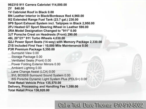 This Is A 2022 911 Cabriolet Due To Arrive 12/24/2021, It Is Still Changeable To Your Desired Configuration. It Is Presently Being Built As Follows.992310 911 Carrera Cabriolet 114,000.002Y840.001V Cabriolet Roof In Black 0.00BN Leather Interior In Black/Bordeaux Red 4,960.000I2 Extended Range Fuel Tank (23.7 Gal.) 230.000P9 Sport Exhaust System Incl. Tailpipes In Black 2,950.002PJ Heated GT Sport Steering Wheel In Leather 590.002RA Model Designation Changed To "911" 0.003J7 Porsche Crest On Headrests (Front) 290.0046L 20"/21" 911 Turbo Wheels 4,030.00Q2J Power Sport Seats (14-Way) With Memory Package 2,330.00Z1S Included First Year / 10,000 Mile Maintenance 0.00P3R Premium Package 5,350.00.Surround View 0.00.Storage Package 0.00.Ventilated Seats (Front) 0.00.Power Folding Exterior Mirrors 0.00.Ambient Lighting 0.00.Lane Change Assist (LCA) 0.00.9VL BOSE® Surround Sound System 0.00.8IS Porsche Dynamic Light System Plus (PDLS+) 0.00Total Retail Vehicle Price 135,570.00Delivery, Processing And Handling Fee 1,350.00Total Retail Price 136,920.00