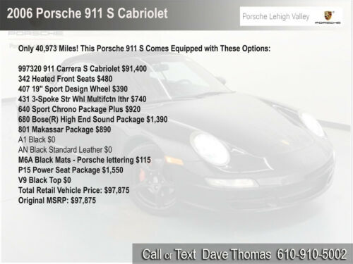 Was $61,995, Only 40,973 Miles! *This Porsche 911 Comes Equipped with These Options:**997320 911 Carrera S Cabriolet $91,400342 Heated Front Seats $480407 19" Sport Design Wheel $390431 3-Spoke Str Whl Multifctn lthr $740640 Sport Chrono Package Plus $920680 Bose(R) High End Sound Package $1,390801 Makassar Package $890*A1 Black $0AN Black Standard Leather $0*M6A Black Mats - Porsche lettering $115P15 Power Seat Package $1,550*V9 Black Top $0Total Retail Vehicle Price: $97,875*Original MSRP: $97,875*