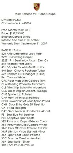 2008 Porsche 911 Turbo (997.1) 6-Speed Coupe: 1 of the approximate 685 997.1 Turbo Coupes to have landed in North America with the 2008 model year designation featuring a manual transmission and in its configuration of coupe, manual, model year and market region, it's 1 of an estimated 10 to have been specified in Carrara White with a cabin completed in Sea Blue Full Leather.