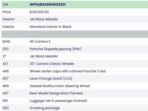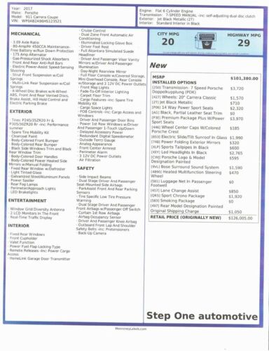 FINANCING AVAILABLE - EXTENDED WARRANTY OPTIONS - NATIONWIDE TRANSPORT - COMPLIMENTARY LOCAL DELIVERY- OPTIONS: - 911 CARRERA S, PORSCHE DOPPELKUPPLUNG (PDK), JET BLACK METALLIC, 20" CARRERA CLASSIC WHEELS, WHEEL CENTER CAPS WITH COLORED PORSCHE CREST, LANE CHANGE ASSIST (LCA), HEATED MULTIFUNCTION STEERING WHEEL, REAR MODEL DESIGNATION PAINTED, LUGGAGE NET IN PASSENGER FOOTWELL, SMOKING PACKAGE, ELECTRIC SLIDE/TILT SUNROOF IN GLASS, POWER FOLDING EXTERIOR MIRRORS, BOSE SURROUND SOUND SYSTEM, STANDARD INTERIOR IN BLACK, PORSCHE LOGO AND MODEL DESIGNATION PAINTED, POWER SPORT SEATS (14-WAY) WITH MEMORY PACKAGE, PREMIUM PACKAGE PLUS I.C.W. POWER SPORT SEATS (14-WAY), SPORT CHRONO PACKAGE, LED HEADLIGHTS IN BLACK INCL. PORSCHE DYNAMIC LIGHT SYSTEM PLUS (PDLS+), SPORT TAILPIPES IN BLACK.