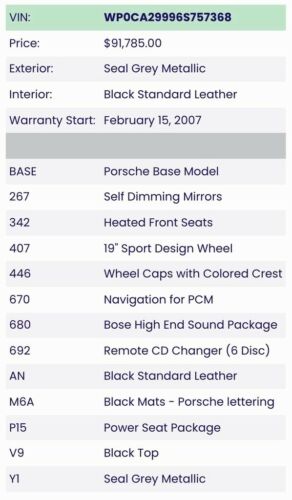 FINANCING AVAILABLE - EXTENDED WARRANTY OPTIONS - NATIONWIDE TRANSPORT - COMPLIMENTARY LOCAL DELIVERY - MSRP:$ 91795 - OPTIONS: -SELF DIMMING MIRRORS, HEATED FRONT SEATS, 19" SPORT DESIGN WHEEL, WHEEL CAPS WITH COLORED CREST, NAVIGATION FOR PCM, BOSE HIGH END SOUND PACKAGE, REMOTE CD CHANGER (6 DISC), BLACK STANDARD LEATHER, BLACK MATS - PORSCHE LETTERING, POWER SEAT PACKAGE, BLACK TOP, SEAL GREY METALLIC.