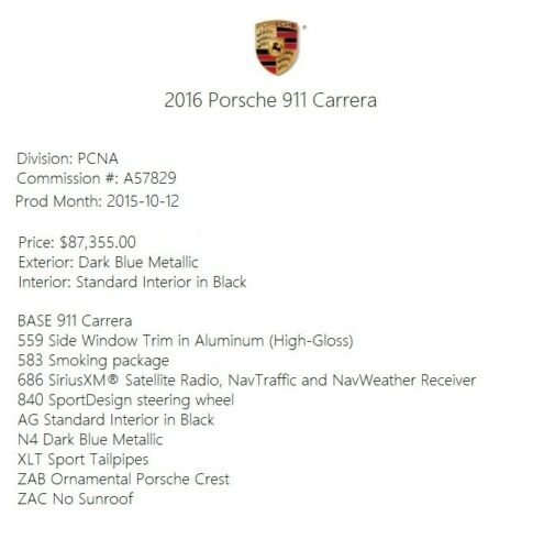 Featured equipment/factory-ordered options (Original MSRP of$87,355): Side Window Trim in Aluminum (High-Gloss); Smoking package; SiriusXM Satellite Radio, NavTraffic and NavWeather Receiver; SportDesign steering wheel; Standard Interior in Black; Dark Blue Metallic; Sport Tailpipes; Ornamental Porsche Crest; No Sunroof.
