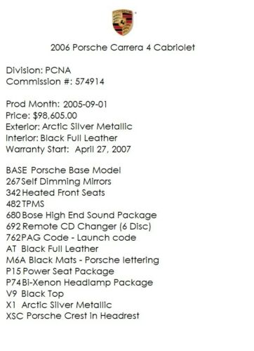 Featured equipment/factory-ordered options (Original MSRP of $98,605): Self Dimming Mirrors; Heated Front Seats; TPMS; Bose High End Sound Package; Remote CD Changer (6 Disc); PAG Code - Launch code; Black Full Leather; Black Mats - Porsche lettering; Power Seat Package; Bi-Xenon Headlamp Package; Black Top; Arctic Silver Metallic; Porsche Crest in Headrest.For more info on this attractive 911 Carrera 4 6-Speed Cabriolet, offered by Ryan Friedman Motorcars, call and/or text us now at 516-217-2580/516-217-2580; we're authentic motorcar aficionados, let's chat!