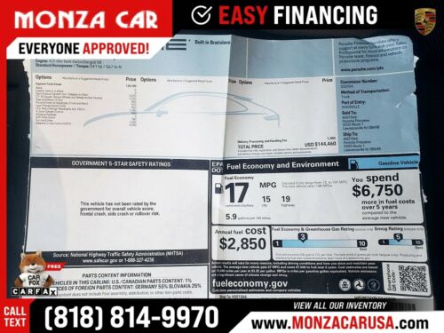 Interior Features 14-Way Driver Seat14-Way Passenger Seat2 Seatback Storage Pockets3 12V DC Power Outlets40-20-40 Folding Split-Bench Front Facing Heated Manual Reclining Fold Forward Seatback Rear SeatAir FiltrationCargo Area Concealed StorageCargo Features -inc: Spare Tire Mobility KitCargo Space LightsCarpet Floor Trim and Carpet Trunk Lid/Rear Cargo Door TrimDay-Night Auto-Dimming Rearview MirrorDelayed Accessory PowerDigital/Analog AppearanceDriver And Passenger Visor Vanity Mirrors w/Driver And Passenger Illumination, Driver And Passenger Auxiliary MirrorDriver Foot RestEngine ImmobilizerFade-To-Off Interior LightingFixed Front Head Restraints and Manual Adjustable Rear Head RestraintsFront And Rear Map LightsFront CupholderFull Alcantara Simulated Suede HeadlinerFull Floor Console w/Covered Storage, Mini Overhead Console, Rear Console w/Storage and 3 12V DC Power OutletsHomeLink Garage Door TransmitterHVAC -inc: Underseat Ducts, Headliner/Pillar Ducts and Console DuctsIlluminated Locking Glove BoxInterior Trim -inc: Piano Black/Aluminum Instrument Panel Insert, Piano Black/Aluminum Door Panel Insert, Piano Black Console Insert, Metal-Look Interior Accents and Leather Upholstered DashboardLeather Door Trim InsertLeather/Metal-Look Gear Shifter MaterialMobile Hotspot Internet AccessOutside Temp GaugePerimeter AlarmPorsche Vehicle Tracking System (PVTS) Tracker SystemRear CupholderRedundant Digital SpeedometerRefrigerated/Cooled Box Located In The Glovebox, Driver / Passenger And Rear Door BinsRigid Cargo CoverSliding Front Center Armrest and Rear Center ArmrestSmart Device IntegrationSystems MonitorTrunk/Hatch Auto-Latch