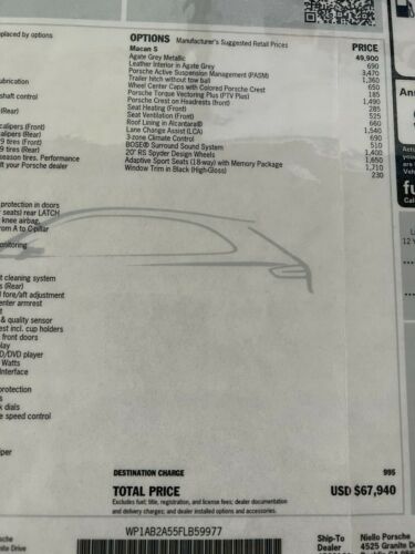 Options include, 20 inch color matching RS Spyder wheels, Premium Adaptive 18 way memory, heated & cooled Sport Seats, full leather cockpit, (doors, dashboard, center console, armrest, Alcantara Headliner), PASM, Trailer Hitch, Wheel Center Caps with Color Porsche Crest, Porsche Torque Vectoring Plus,(PTV), Porsche Crest on Headrest, Lane Change Assist, Bose Surround Sound, (Wonderful Audio w/ deep base), Window Trim in Black High Gloss. Dash is also trimmed in Piano Black. Total Options are $18,000. Tinted front Windows to match the rear, Porsche OEM Cargo Tray, Porsche oem Sunshield