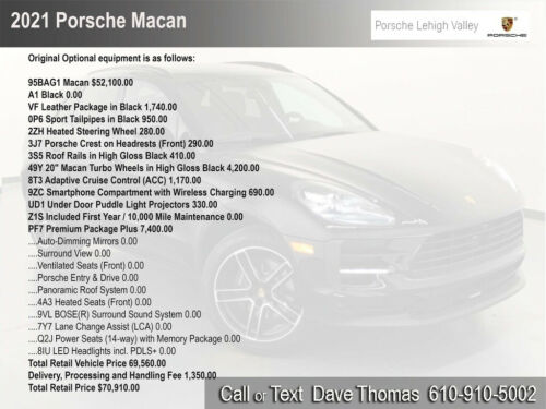 Original Optional equipment is as follows:*95BAG1 Macan 52,100.00A1 Black 0.00VF Leather Package in Black 1,740.000P6 Sport Tailpipes in Black 950.002ZH Heated Steering Wheel 280.003J7 Porsche Crest on Headrests (Front) 290.003S5 Roof Rails in High Gloss Black 410.0049Y 20" Macan Turbo Wheels in High Gloss Black 4,200.008T3 Adaptive Cruise Control (ACC) 1,170.009ZC Smartphone Compartment with Wireless Charging 690.00UD1 Under Door Puddle Light Projectors 330.00*Z1S Included First Year / 10,000 Mile Maintenance 0.00*PF7 Premium Package Plus 7,400.00*.Auto-Dimming Mirrors 0.00.Surround View 0.00.Ventilated Seats (Front) 0.00.Porsche Entry & Drive 0.00.Panoramic Roof System 0.00.4A3 Heated Seats (Front) 0.00.9VL BOSE(R) Surround Sound System 0.00.7Y7 Lane Change Assist (LCA) 0.00.Q2J Power Seats (14-way) with Memory Package 0.00.8IU LED Headlights incl. PDLS+ 0.00*Total Retail Vehicle Price 69,560.00Delivery, Processing and Handling Fee 1,350.00Total Retail Price 70,910.00*
