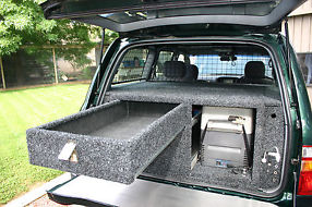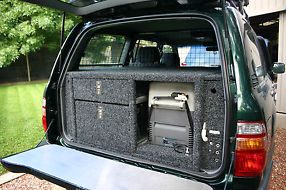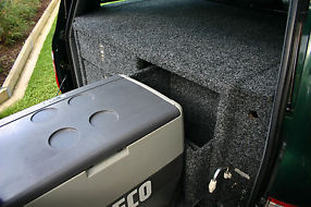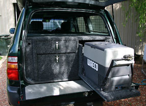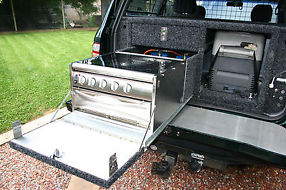 Custom built drawer system with 3 burner gas stove and griller, Waeco 45 litre fridge