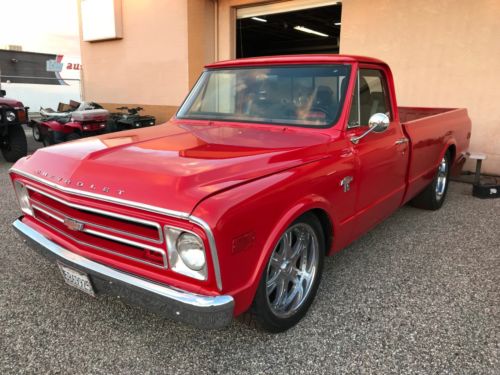 This 67 Chev is a true factory short bed, 2wd, bright red, exceptional paint on a very straight body, no rust (California truck). Front and rear bumpers are new, all stainless around grill is perfect. This C-10 pickup is powered