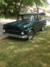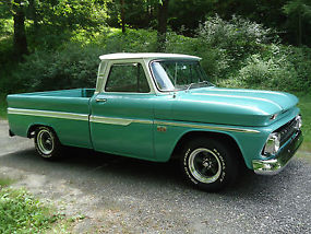 Beautiful Green with White Top 1966 Chevrolet Short Bed Fleetside Truck with nice wood bed. Has a 350 engine with a small cam intake ,4 barrel carburetor, 350 transmission , and a stock rear end. The Truck does has some filler i