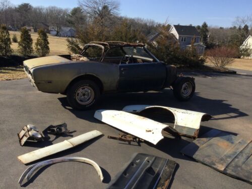 1968 Camaro convertible project car, manual top, factory V8 4 speed car, British green, standard interior. 350 4 bolt main 010 engine with 4 speed Saginaw and zbar.Car is solid, good frame rails, good rockers, all glass is good, w