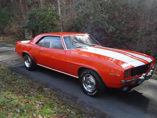 1969 camaro z28 rs 302dz org. engine with smog munice 4 speed org. rearend 12 bolt 373 bu correct color hugger orange new interior white houndstooth new black carpet yh wheels with bias ply goodyear tires correct cowl hood org. hu